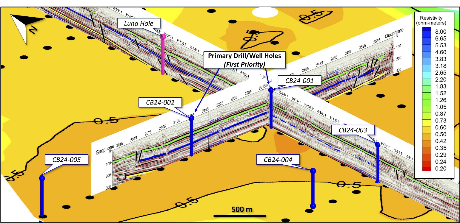 - The previously completed 2D active seismic survey at Columbus provides pivotal data on the subsurface structure along two key lines: north/south and east/west. This seismic technique was instrumental in complementing the HSAMT survey, offering a more nuanced understanding of the Columbus Basin’s geological features. The primary benefit of the 2D active seismic survey was its ability to provide detailed cross-sectional images of the subsurface. These images were essential in mapping the variations in sedimentary layers and identifying potential fault zones as well as understanding the structural controls on mineralization. The seismic data allowed for a detailed visualization of the stratigraphic and structural variations across distinct parts of the Columbus Basin. The seismic survey offers insights into the depth, thickness, and continuity of stratigraphic units, which are key factors in assessing the Project’s potential for hosting lithium brines. The integration of 2D active seismic data with HSAMT results significantly enhanced the geological model of the Columbus Basin, aiding in the precise targeting of drilling operations and reducing exploration risks (see Figure 3).