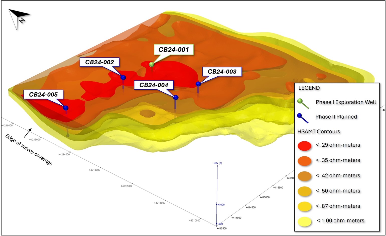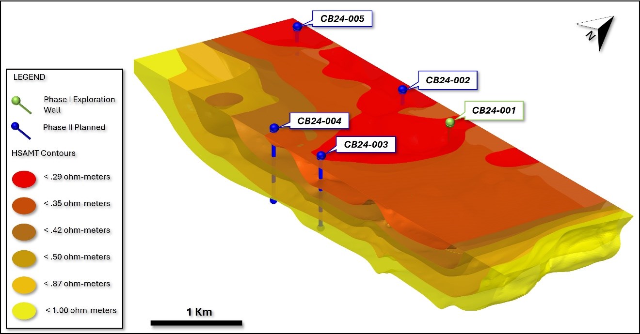 The HSAMT ground-based geophysical method has enabled the mapping of subsurface resistivity through detailed 3D modeling, indicating several resistivity-defined shells spanning a volume extending 5 km wide by 10 km long and down to depths of approximately 600 metres. These highly conductive shells, indicative of brine solutions, are the focus of the Company’s lithium enriched targeting efforts. Supporting the HSAMT data, historical surface sampling and prior drilling in less conductive areas, considered less prospective, have yielded lithium values up to 1600 ppm and boron levels exceeding 10,000 ppm, revealing a multi-tiered aquifer system.