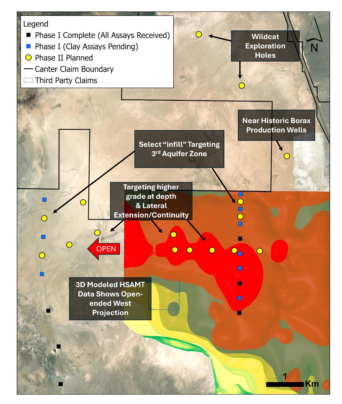 "Our Phase II program has been designed to target a third aquifer zone below the limits of Phase I drilling, demonstrate lateral continuity between our Phase I grids and test regional discovery targets to the north," stated Canter CEO, Joness Lang. "The Phase II program will include select multi-element geochemical analysis, provide samples suitable for preliminary direct extraction considerations, further validate and refine our exploration model and deeper lithium targets, while concurrently assessing the extent and mineral resource potential of the significant near-surface boron mineralization."