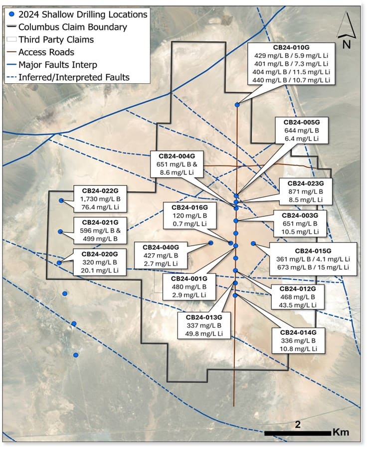 - Clear Potential for Higher-Grade Lithium at Depth: Structural and hydrological similarities between the Columbus Basin and Clayton Valley-Nevada's premier lithium-producing basin-indicate that deeper aquifers may host more concentrated lithium-boron brines. With shallow zones already returning substantial anomalous values and evidence of structural traps within a closed hydrological system, Columbus exhibits the hallmarks of a maturing lithium-boron brine basin capable of delivering significantly higher grades at depth.