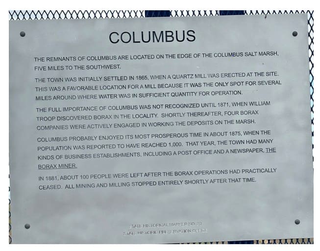 Image 1. Historic marker at the Columbus Project entrance referencing historical borax operations