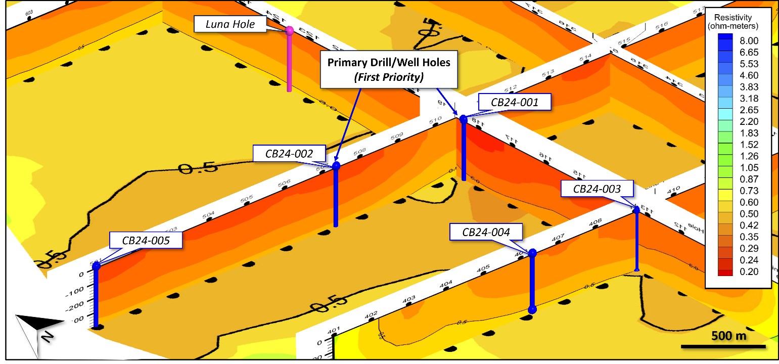 - The Hybrid Source Audio Magnetotellurics (HSAMT) survey conducted by Hasbrouck Geophysics, Inc. in 2021 at the Columbus Basin has provided critical insights into the subsurface chargeability and geological strata. The HSAMT results revealed a highly conductive, homogenous zone extending several kilometres below the surface. This conductive profile is attributed to the presence of highly saturated and conductive clays near the surface, along with similar conductive layers deeper in the subsurface. The survey was designed to identify potential conductors indicative of lithium-bearing brines and allowed for comprehensive profiling of subsurface resistivity in three dimensions. The processed data revealed favourable low resistivity values (0.2 to 0.5 ohm-metres) near the surface down to approximately 2,200 feet in certain areas, suggesting the potential for a large brine target (see Figure 2 above).
