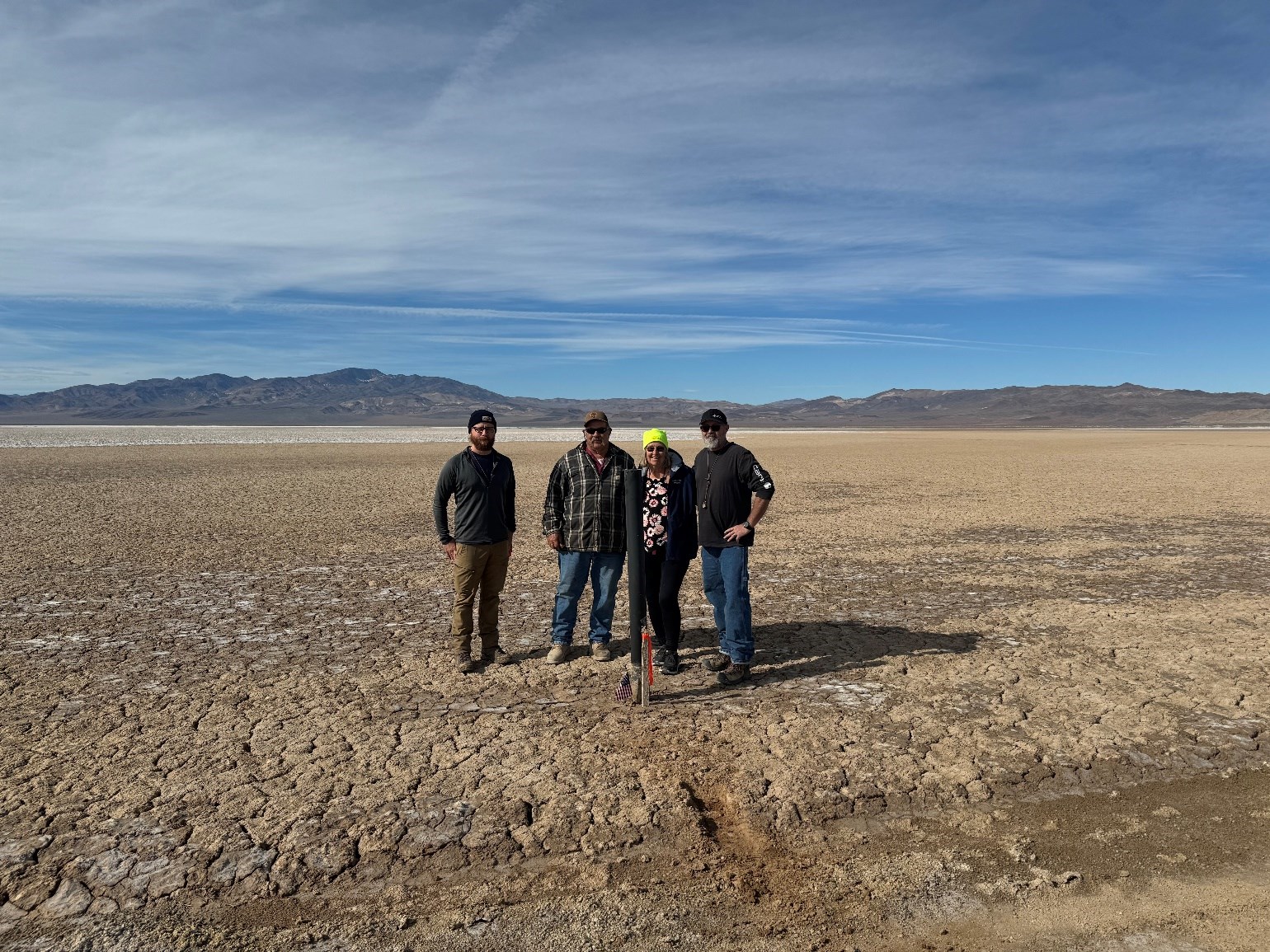 Photo 1: (From left to right) Korbon McCall (Project Manager), Dick Merritt (Merritt Construction), Barbara Craig (renowned lithium prospector and Columbus Project vendor) and Trevor Hawkins (Senior Geologist) at the collar location for LUN-22-01.Summary and Key Takeaways