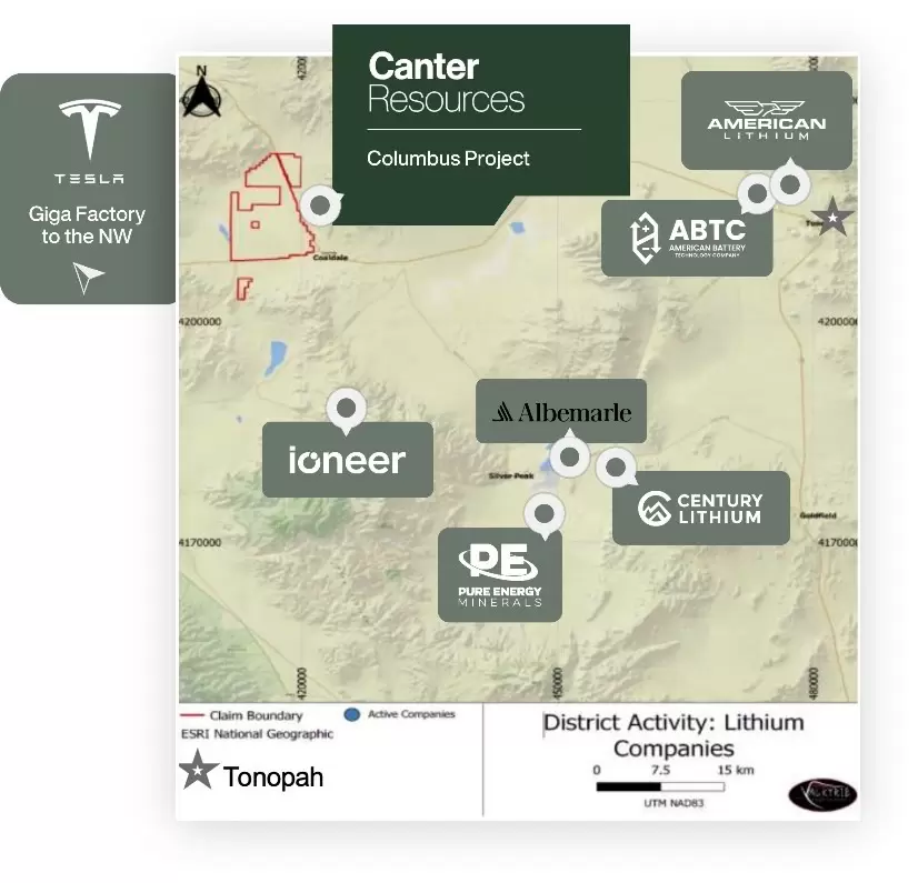 Canter’s wholly-owned subsidiary, Altitude Ventures Corp (“Altitude”), holds the sole option to acquire a 100% interest of the 23,000-acre Columbus Project located in the Columbus Salt Marsh Basin, Esmerelda County, Nevada, USA (see press release dated November 13, 2023 for more information). This basin or playa lakebed was the site of historic borate production in the late-1800s. Importantly, the Columbus Basin is unique in that it is structurally and hydrologically enclosed by the surrounding volcanic source rocks, indicating that any lithium, boron and potassium mineralization that has leached into the Columbus Basin over the past 23 million years has had nowhere to escape (see Geologic and Structural Setting section below).