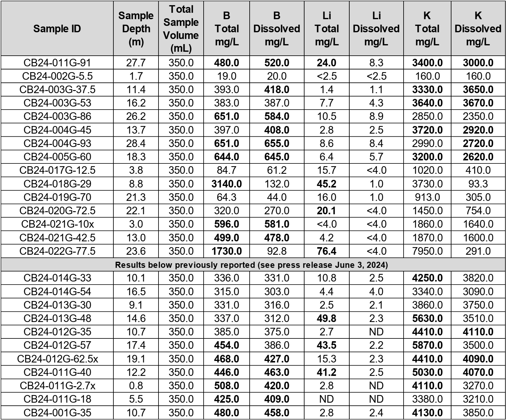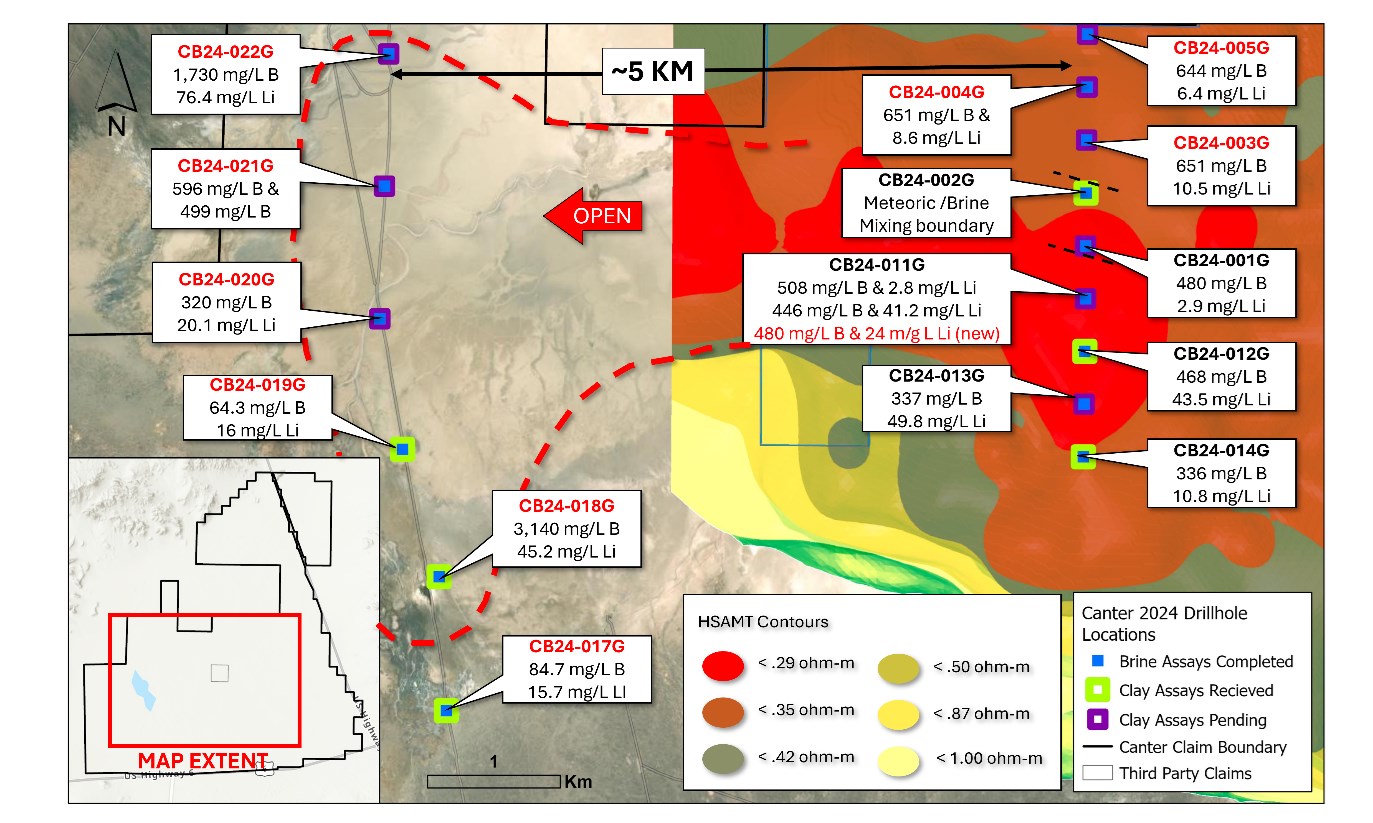 Drilling in the western grid (six holes), located approximately five (5) km west of the central grid, was designed in part to test the inferred open-ended projection of the HSAMT anomaly (see press release April 8, 2024). Significant mineralization was observed, with peak boron values reaching up to 3,140 mg/L B (CB24-018G) and 1,730 mg/L B (CB24-022G). CB24-021G also returned consistent boron at multiple depths (499 mg/L and 596 mg/L B) located directly due west from the HSAMT projection (see Figure 1). Total lithium concentrations ranged from 4.2 to 76.4 mg/L Li (consistently > 15 mg/L), underpinning the potential for widespread mineralization laterally.