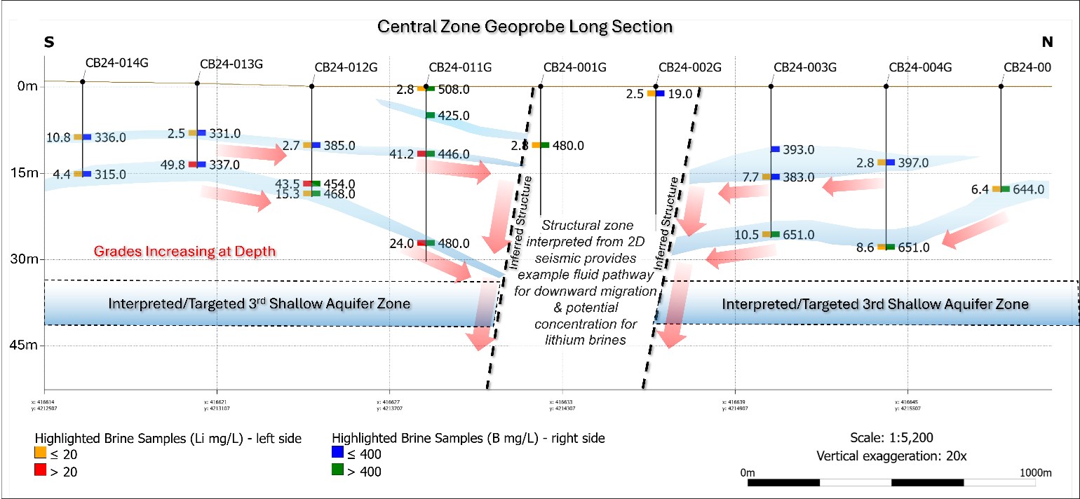Figure 2 - Long section view (looking west) of central drilling grid showing interpreted aquifer zones, inferred structure and brine mixing boundary, increasing Li-B concentration trends and interpretive shallow aquifer zones including a third favourable horizon (based on previous downhole geophysics) that will be tested in Phase II.