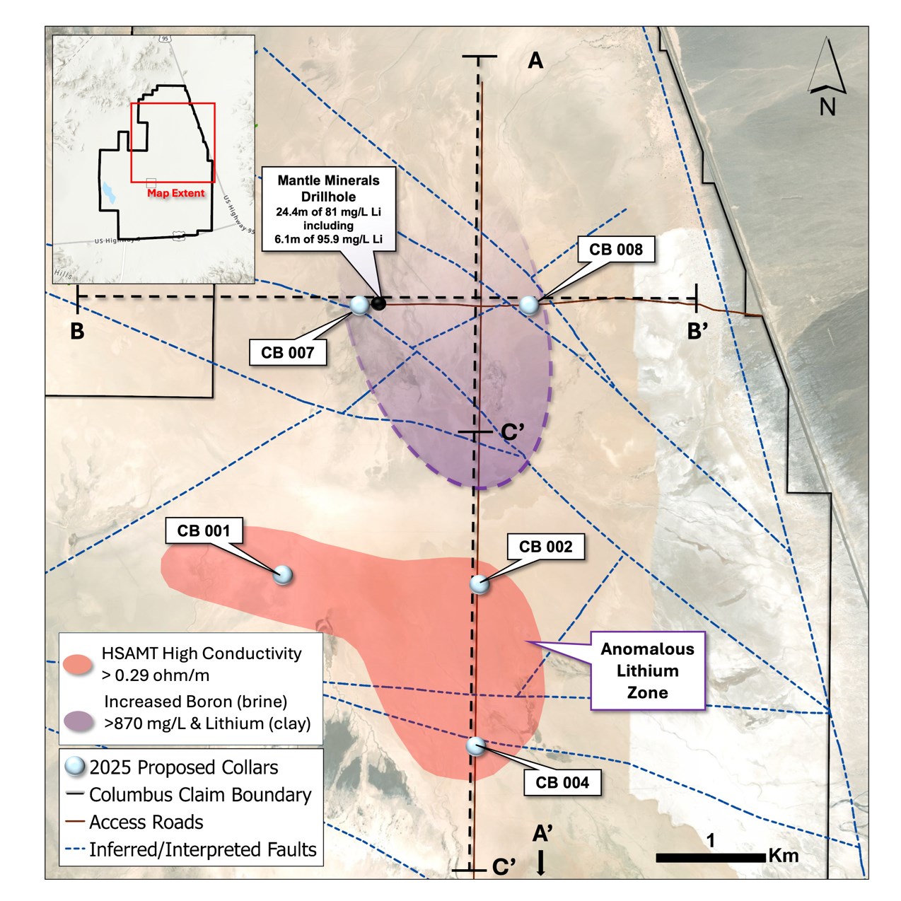 The Company is advancing its exploration within the Columbus Basin by deploying a comprehensive auger sampling grid (see Figure 1). This initiative targets the shallow brine-generating strata, where historical data indicates substantial lithium and boron concentrations. This approach allows for a broad assessment of the basin’s mineral potential with minimal environmental impact and refines the geochemical profile of the near-surface brines.