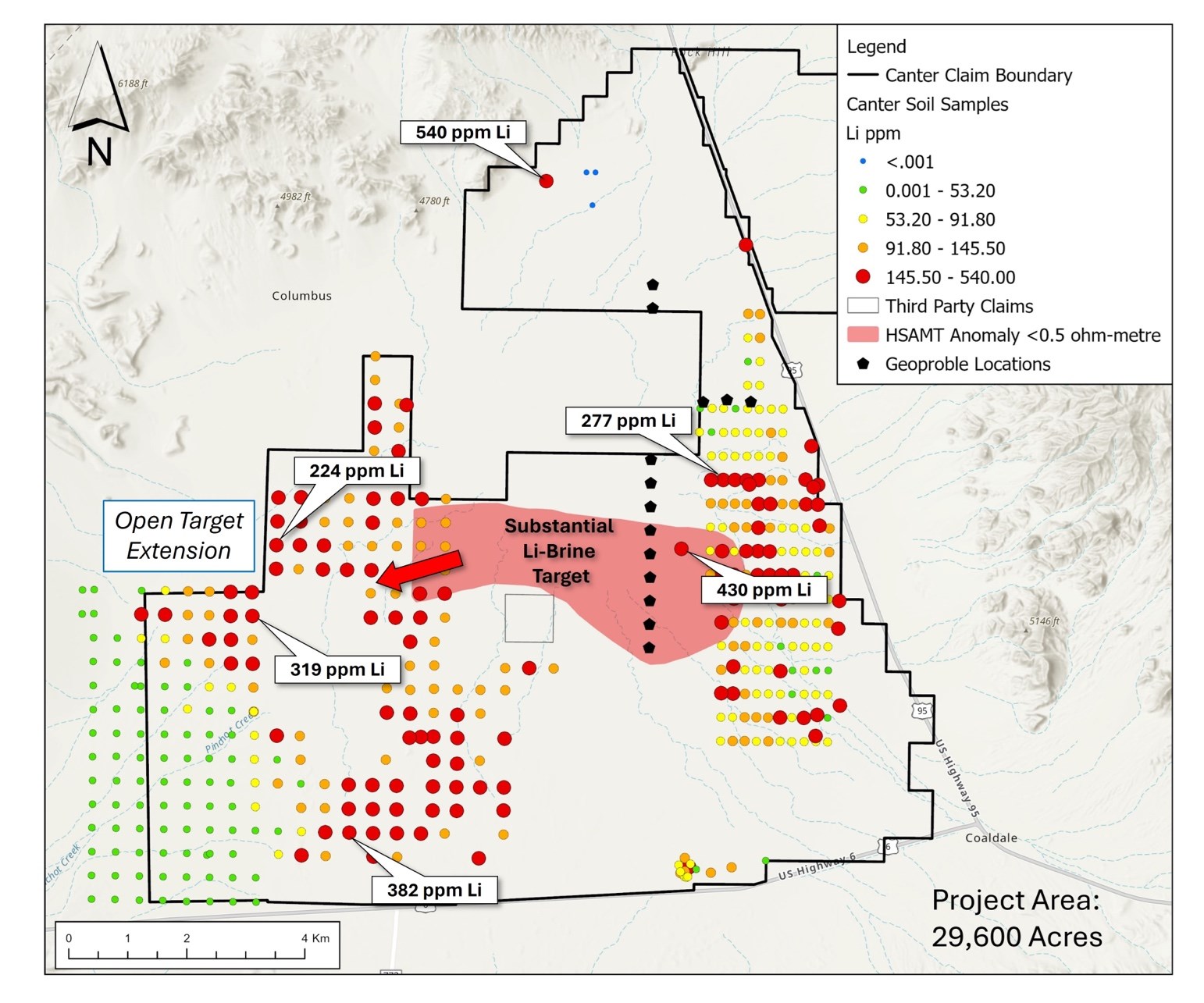 Vancouver, British Columbia, April 23, 2024 – Canter Resources Corp. (CSE:CRC | OTC:CNRCF | FRA:601) (“Canter” or the “Company”) is pleased to report that the Company has commenced a 10-hole Geoprobe drill program at the Columbus Lithium-Boron Project (“Columbus” or the “Project”), located near Tonopah, Nevada.