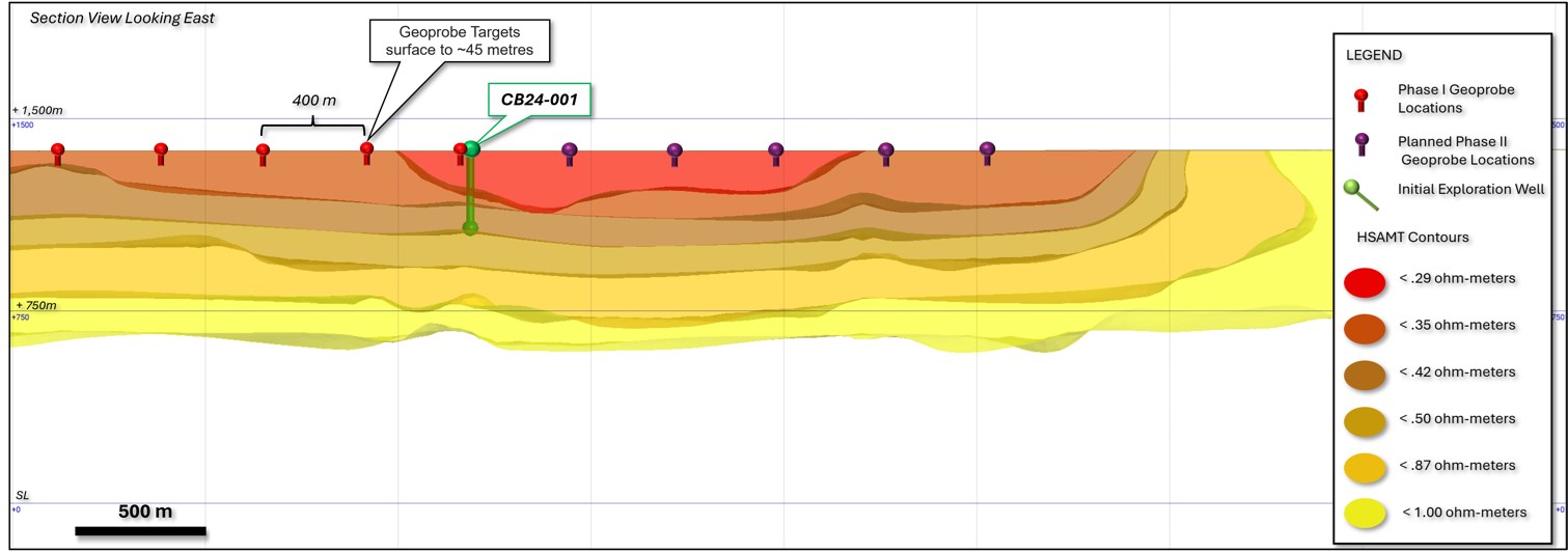 Figure 1: Section view (3D model slice) of HSAMT modeling with Geoprobe and initial exploration well locations shown. A total of 10 Geoprobe drill holes are expected to be completed in Phase I.“The shallow Geoprobe program compliments our upcoming exploration well drilling as part of Phase I work and will provide us with another valuable dataset at Columbus,” stated Joness Lang, CEO of Canter Resources. “Our primary lithium-enriched aquifer targets are at more moderate depths; however, this highly conductive upper interval is intriguing and if our first phase of Geoprobe drilling is successful we will consider shallow grid drilling to define the extent of near-surface mineralization.”